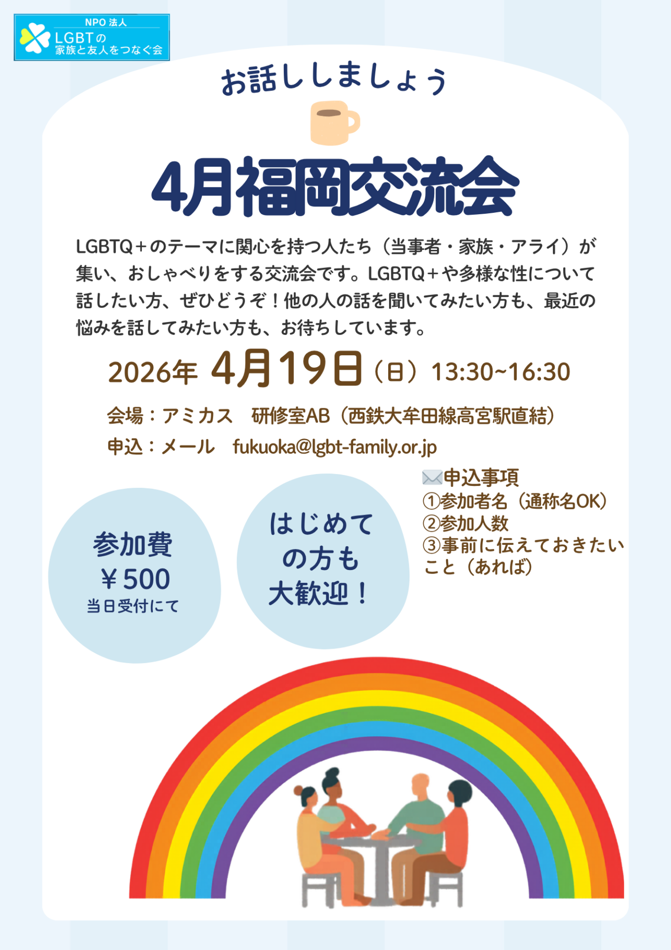 「LGBTの家族と友人をつなぐ会」は未だ社会に存在するLGBTへの差別や偏見をなくすために、そしてあらゆる人々がその多様性を認め合える社会を作るために設立されたものです。