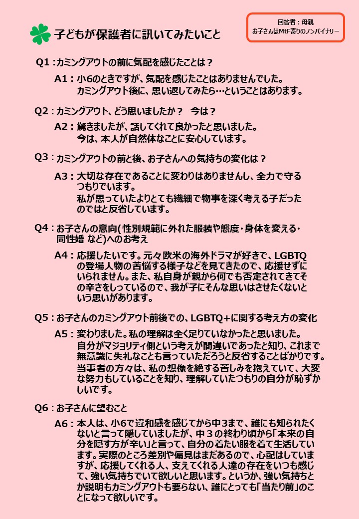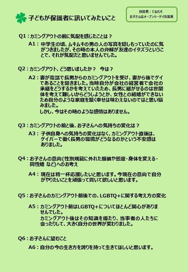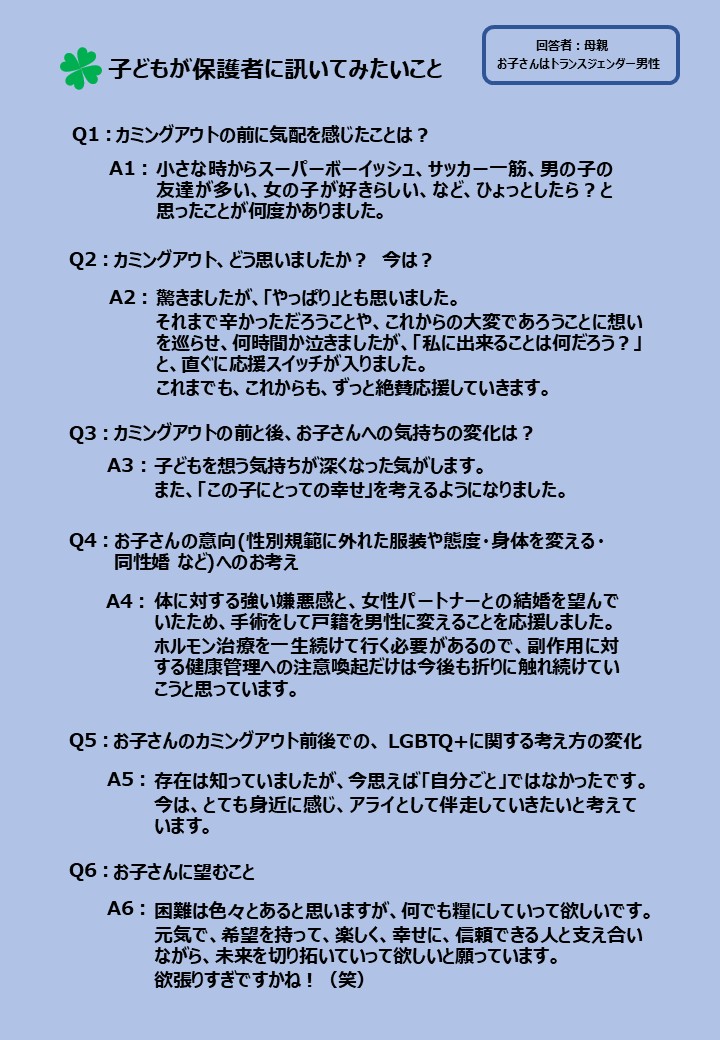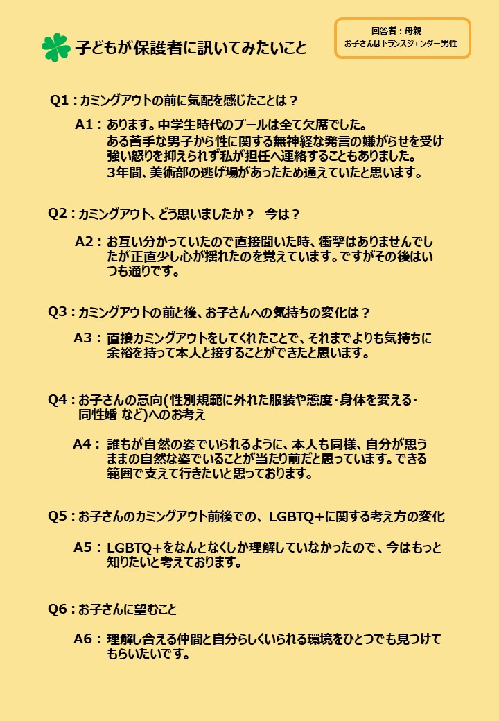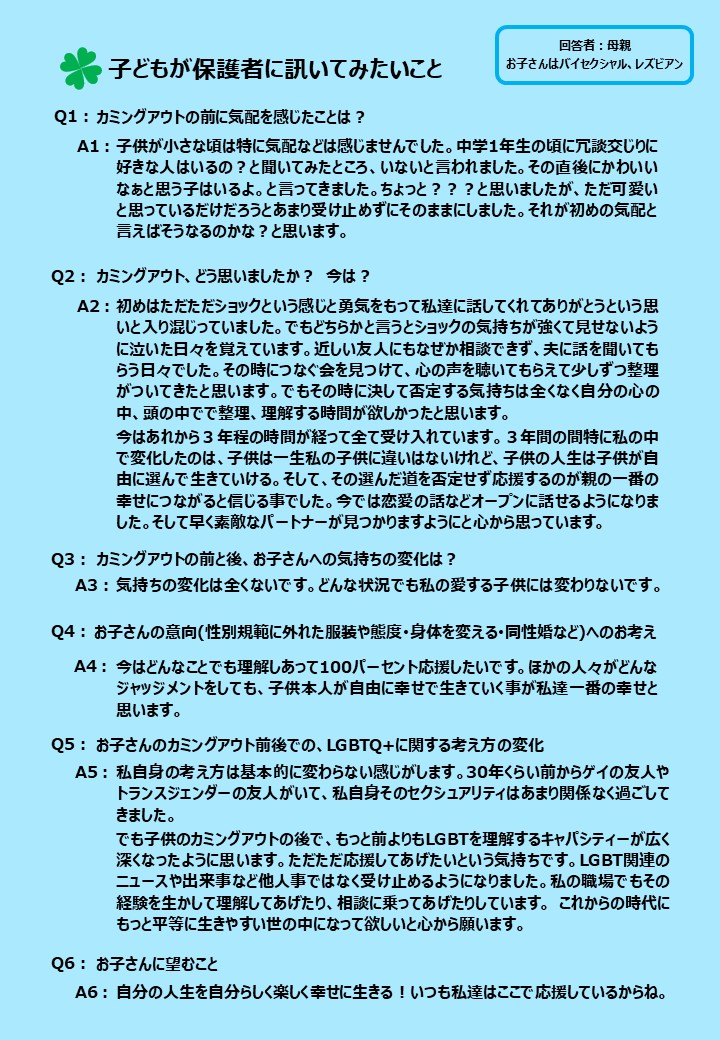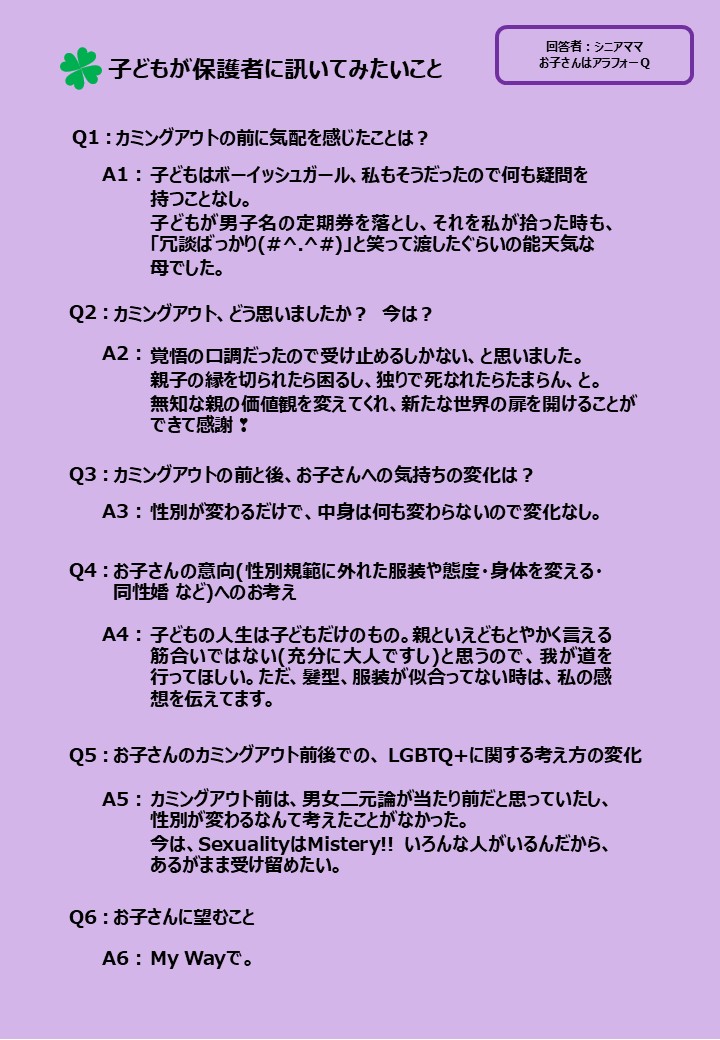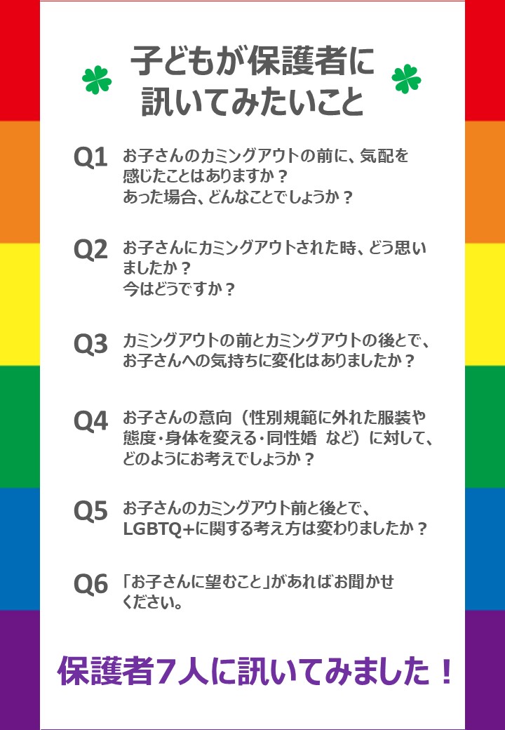 LGBTQ+ユースから保護者に訊いてみたい質問を募り、その中から関心の高かった6つの質問に、様々なセクシュアリティの子どもを持つ保護者7名に答えてもらいました。それぞれが愛溢れる素敵な回答だったので1枚づつパネルにして、2025年6月の東京プライド、11月の九州レインボープライド、同じく11月に都内で行われた東京トランスマーチ2025にてブース出展した際に展示しましたのでご紹介します。